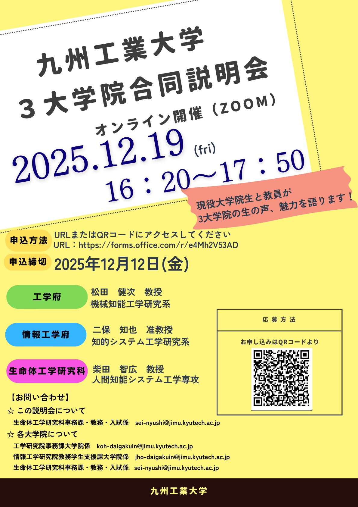 【お問い合せ先】 ⽣命体⼯学研究科教務・⼊試係 E-mail:sei-nyushi[at]jimu.kyutech.ac.jp