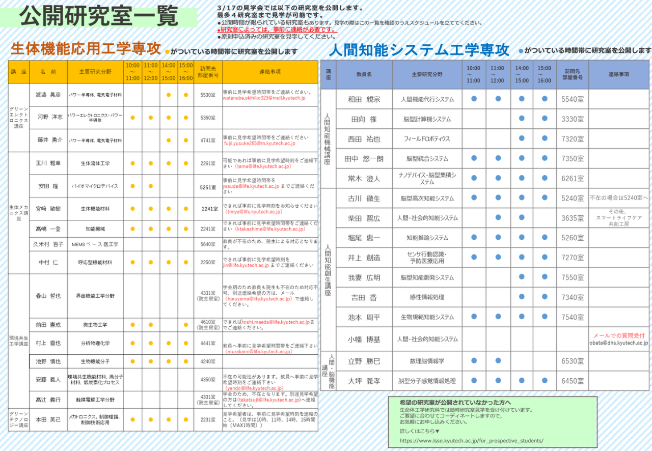 研究室によっては、教員へ見学希望時間を事前にメール連絡が必要です!
